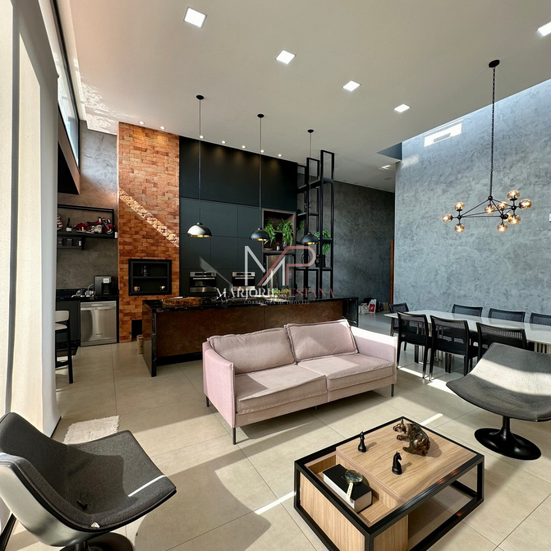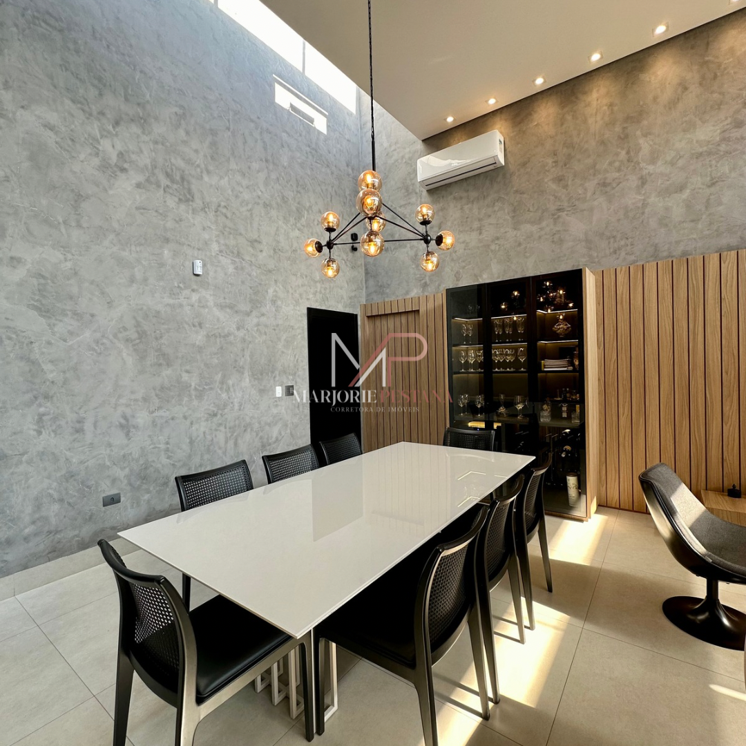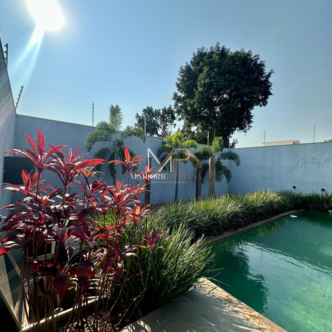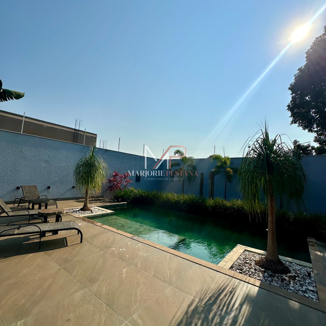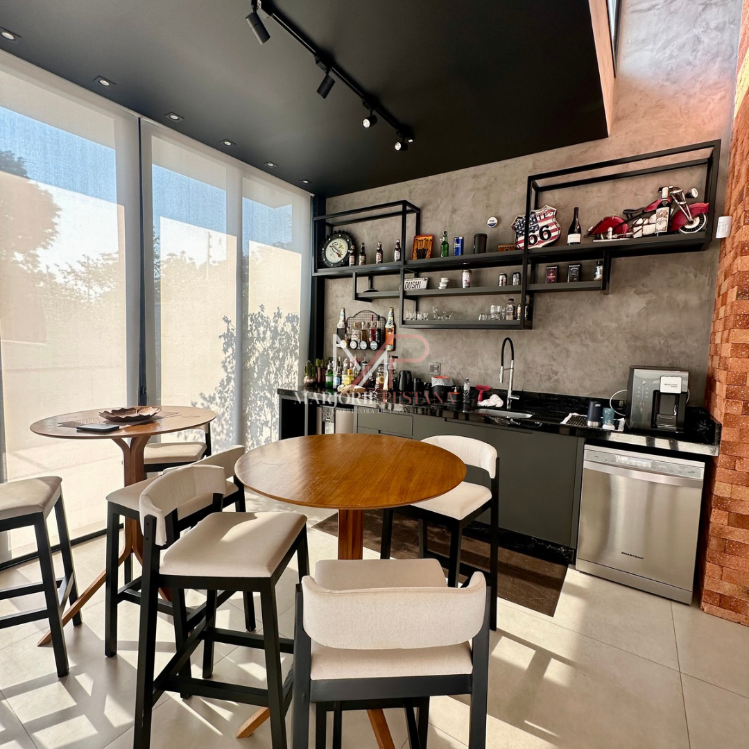 Contendo: 01 suíte com móveis planejados, 02 quartos com móveis planejados, bwc social, sala de TV, sala de jantar c/ ampla cozinha gourmet conjugada, escritório com lavabo. Área de serviço mobiliada, com estendal. Área de lazer com piscina borda infinita e paisagismo. Ampla garagem para veículos lado a lado.