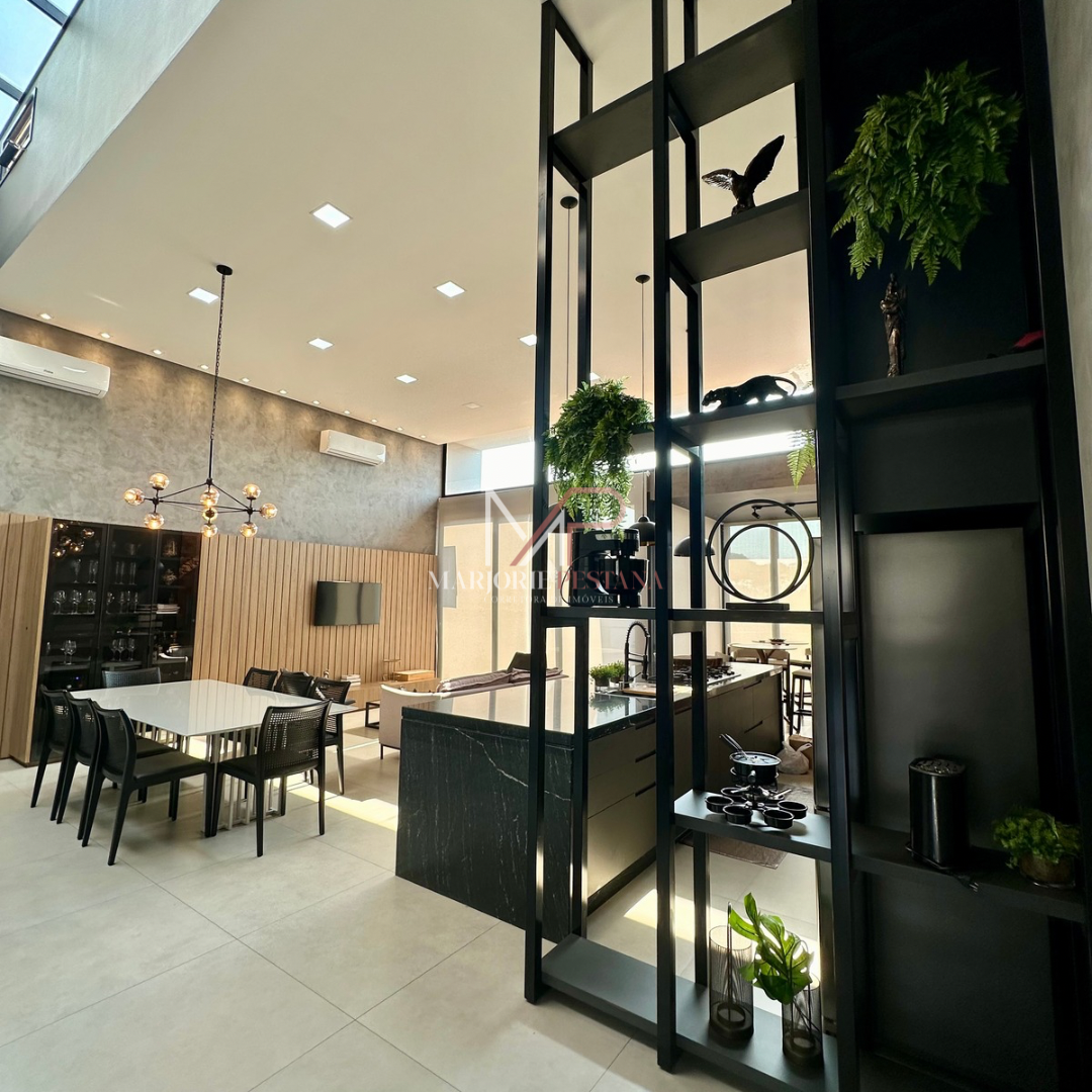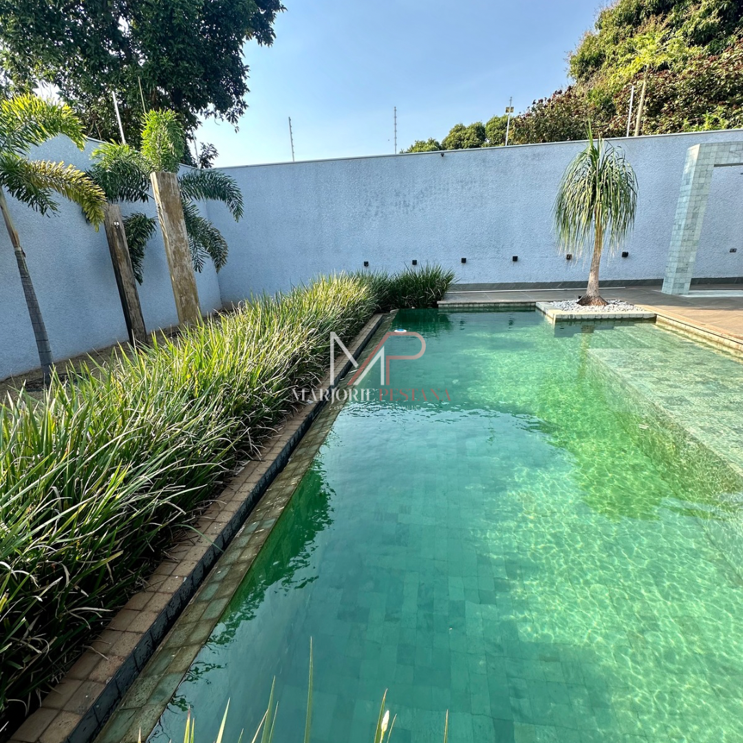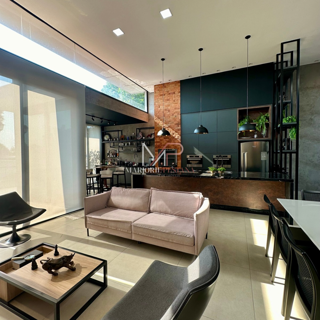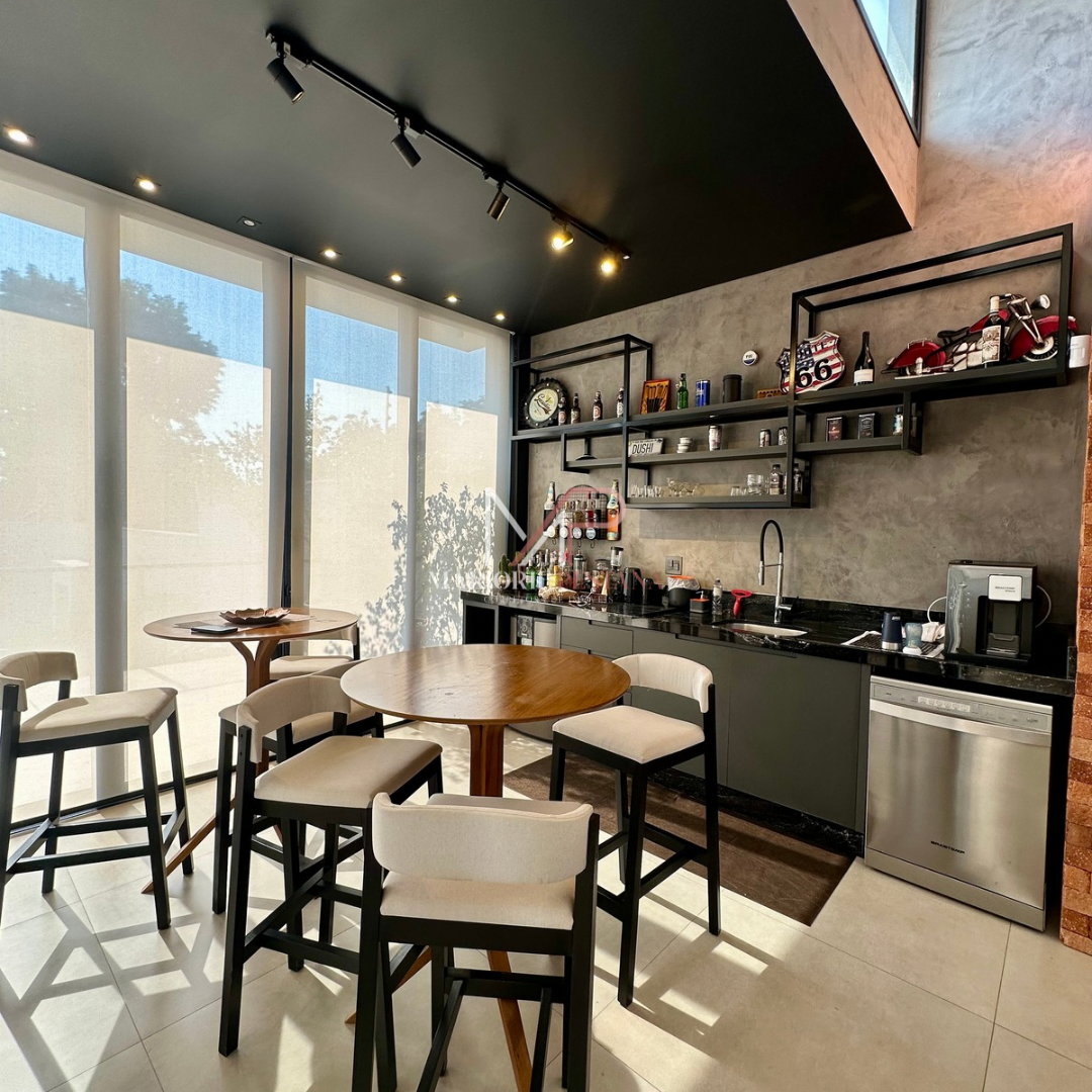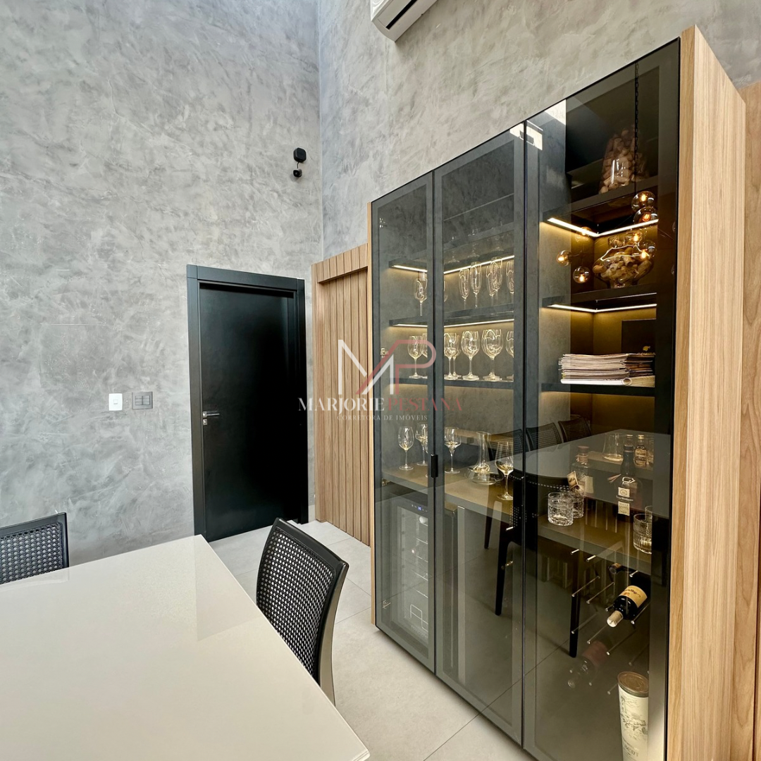 Contendo: 01 suíte com móveis planejados, 02 quartos com móveis planejados, bwc social, sala de TV, sala de jantar c/ ampla cozinha gourmet conjugada, escritório com lavabo. Área de serviço mobiliada, com estendal. Área de lazer com piscina borda infinita e paisagismo. Ampla garagem para veículos lado a lado.