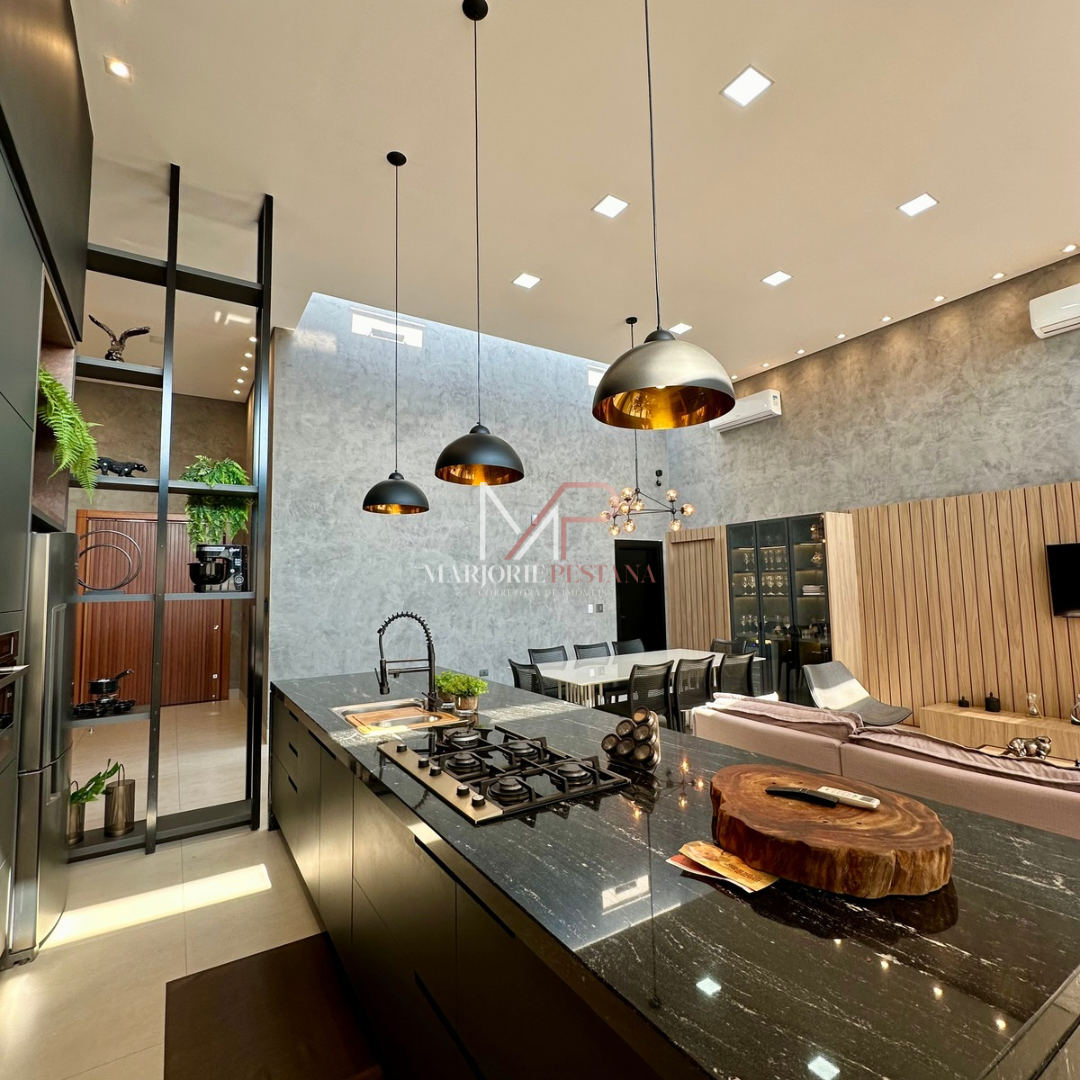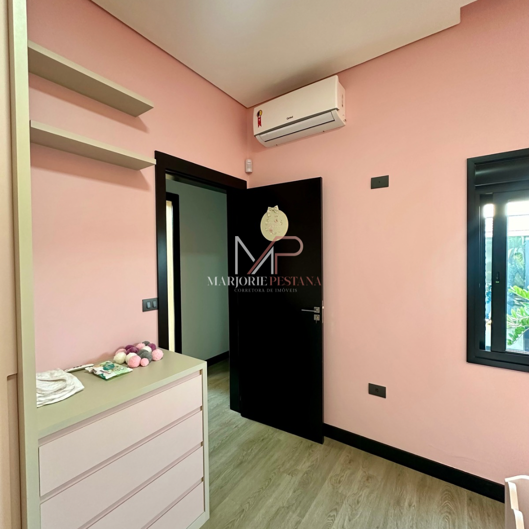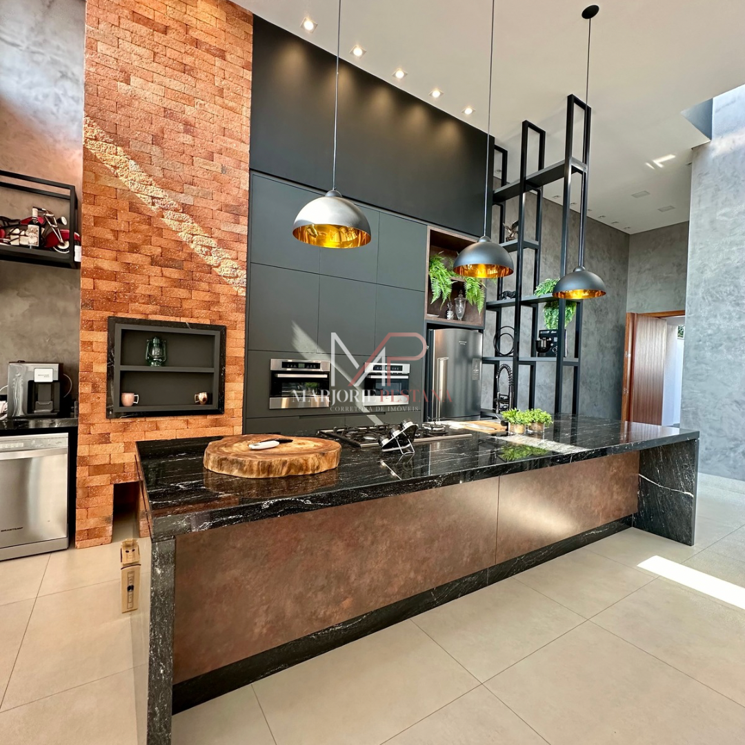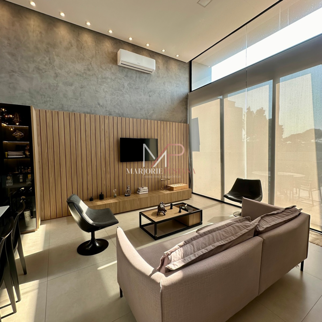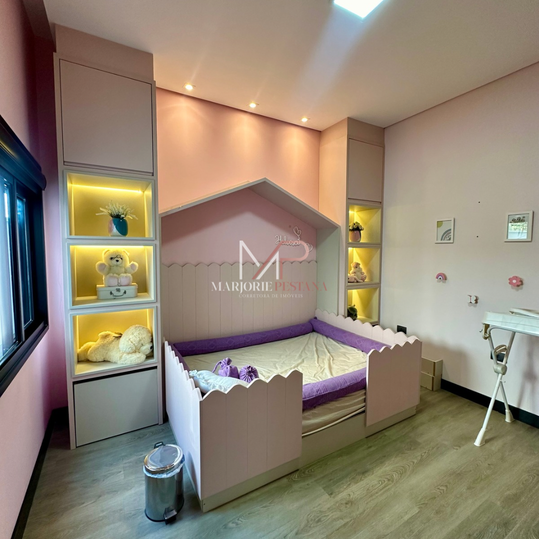 Contendo: 01 suíte com móveis planejados, 02 quartos com móveis planejados, bwc social, sala de TV, sala de jantar c/ ampla cozinha gourmet conjugada, escritório com lavabo. Área de serviço mobiliada, com estendal. Área de lazer com piscina borda infinita e paisagismo. Ampla garagem para veículos lado a lado.