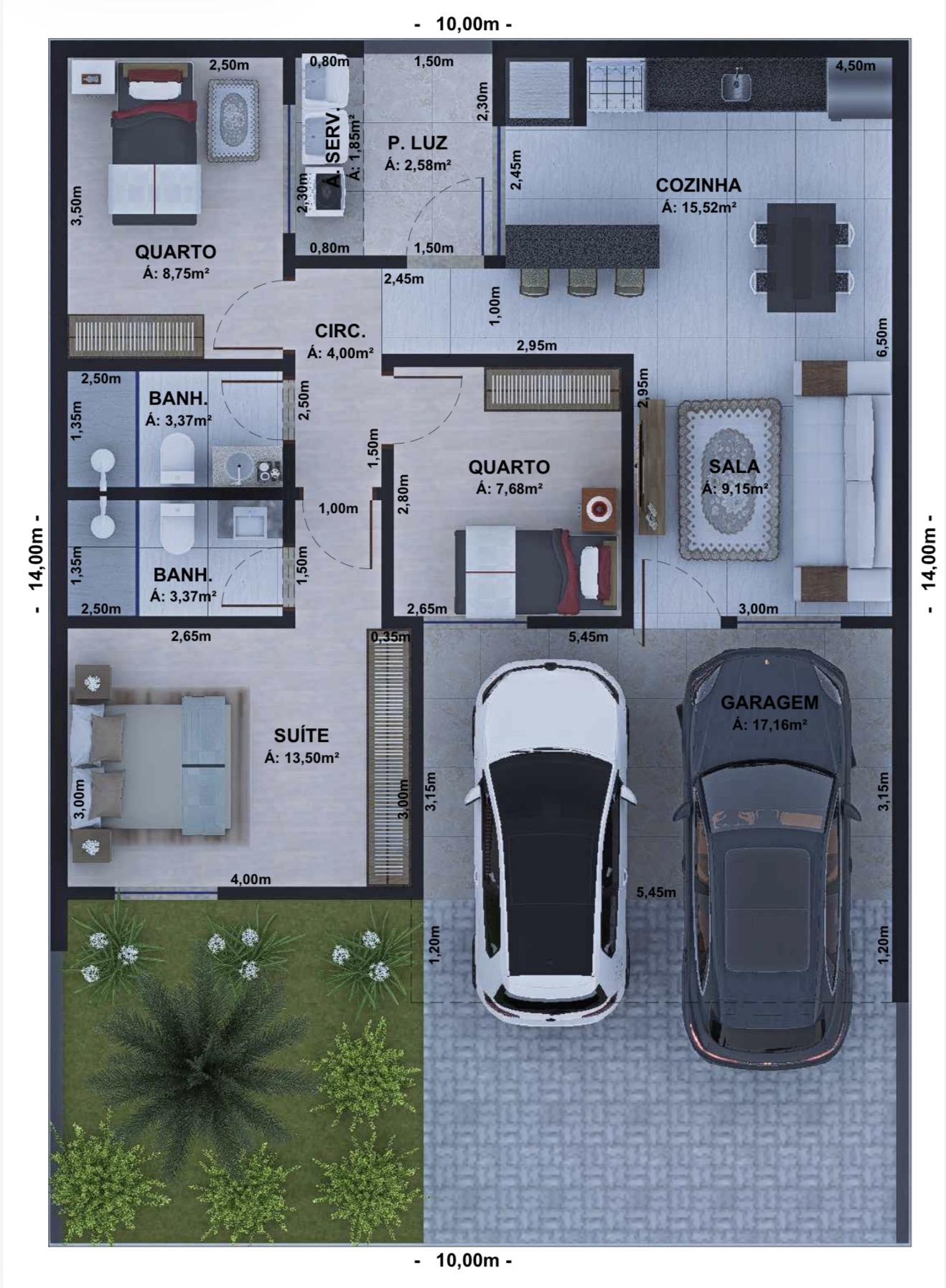 Contendo: 01 suíte, 02 quartos, bwc social, sala e cozinha conjugada com pé direito alto, poço de luz com área de serviço, garagem coberta para 02 carros.